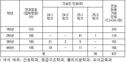 6. 기타사항: 간호학과, 응급구조학과, 물리치료학과, 유아교육과로의 전과는 불허